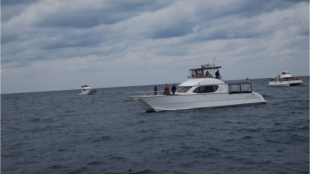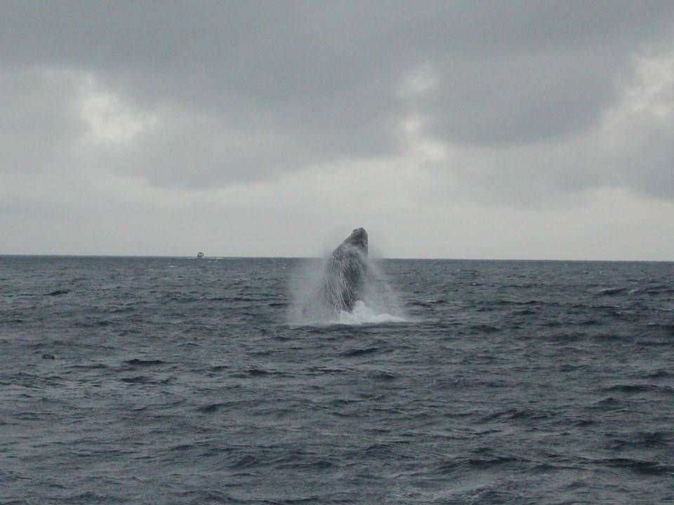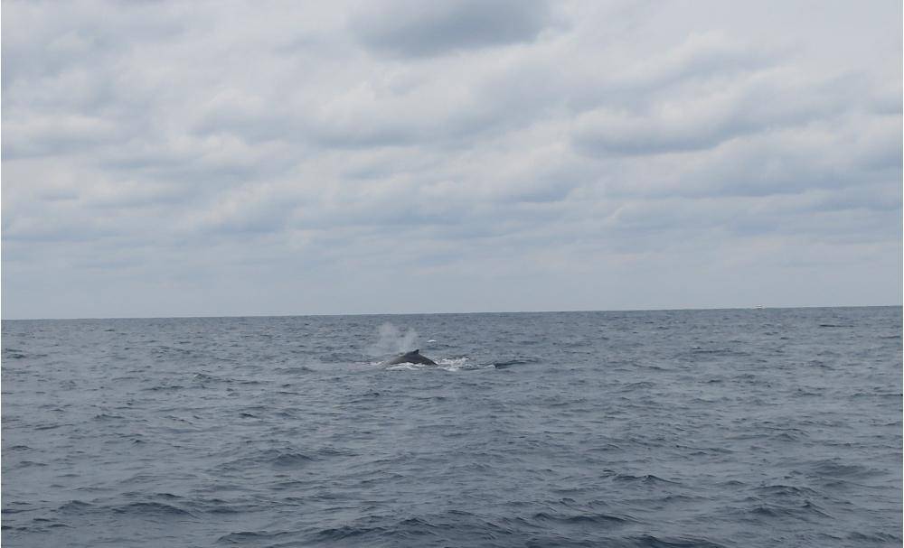我們又在海面上載浮載沈了一會兒,船長與工作人員眼光四處逡巡尋找鯨魚的蹤影,接著船隻再次加速,我們知道鯨魚又出現了,此時也有另外三、四艘船隻接近一起觀看。在接下來將近一個小時的航程裡,就如此不斷重覆著這樣你追我跑的情況,雖然鯨魚總會在不遠處出現,但船隻快速接近後,牠們總在不久後便下潛。