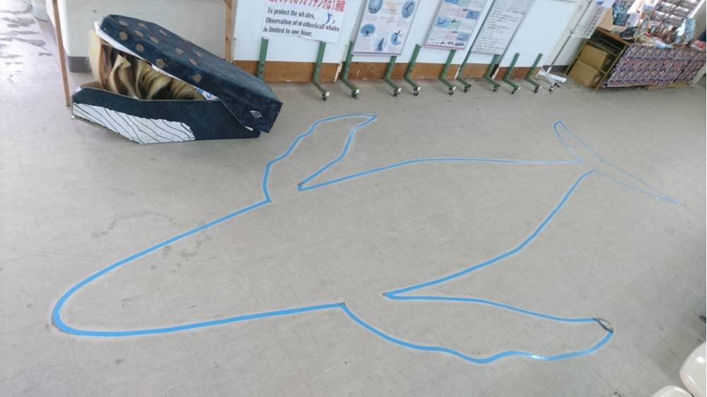 偌大的解說空間裡,除了有許多海報、模型、標本可以先了解鯨魚之外,最吸睛的就是地上貼的鯨魚圖樣了。一大一小兩隻大翅鯨真實大小的輪廓,讓人一走進去就能直接親身感受到鯨魚的巨大,是非常切身且不需言語的解說。